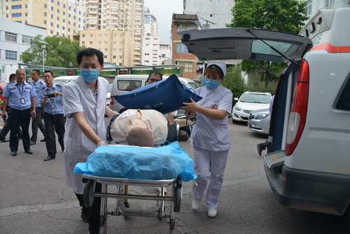 本次演练模拟某乡镇发生械斗致大量人员受伤,下午3时,“120”调度室接到报警,立即上报并第一时间通知救护车及时出诊,所有应急急救小组人员迅速到位,同时开通绿色通道,启动突发公共事件应急预案。
